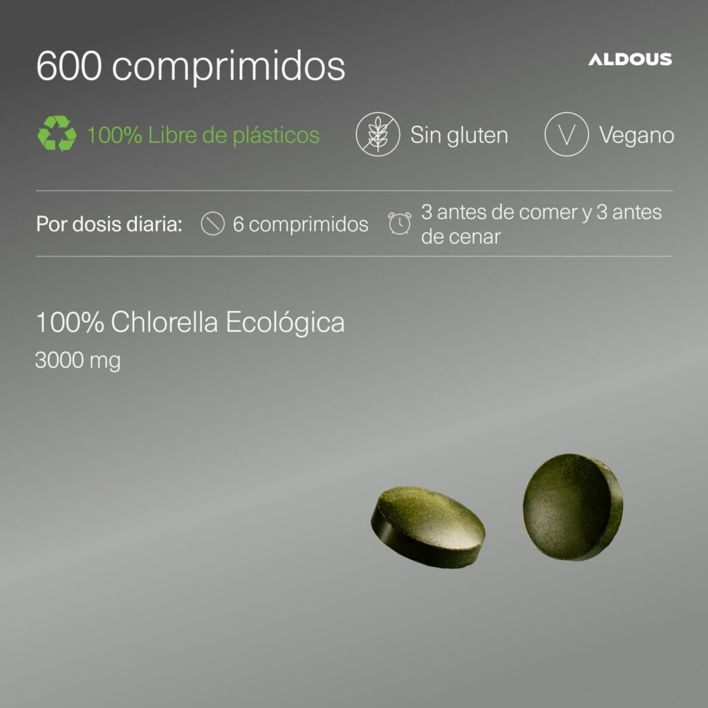 Hoy analizamos en detalle la Aldous Pura Chlorella Ecológica 600 comprimidos, un formato con 600 comprimidos, 3000 mg por dosis diaria y pared celular rota para mejor absorción.